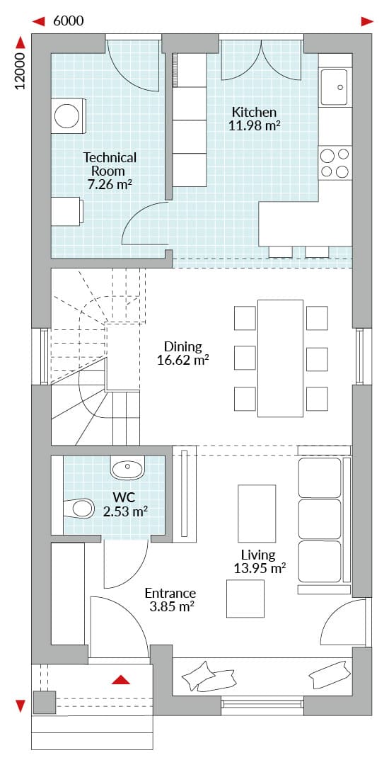 3-bedroom, 2-storey house, covered entrance to open-plan living room/dining and kitchen area, staircase, technical room, WC, master bedroom with en-suite and walk-in wardrobe, two single bedrooms, family bathroom, storage.
