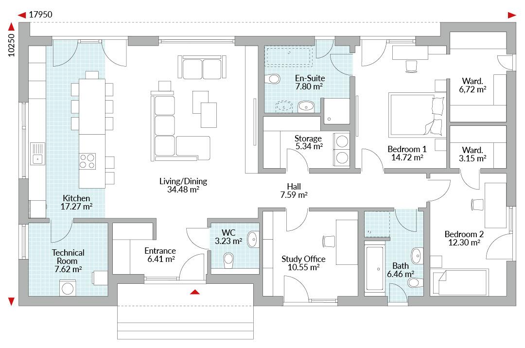 2-bedroom bungalow, entrance, WC, open-plan living/dining/kitchen area with cooking island, technical room, study/office, master bedroom with en-suite bath/shower room and large walk-in wardrobe, single bedroom with walk-in wardrobe, family bathroom, storage.