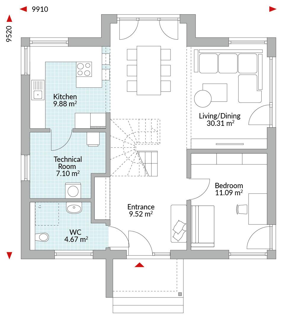 1½-storey, 4-bedroom detached house, entrance hall and staircase, open-plan living/dining kitchen area, technical room, WC, bedroom on ground floor, master bedroom with en-suite and walk-in wardrobe/dressing area, two single bedrooms, family bathroom, wardrobe.