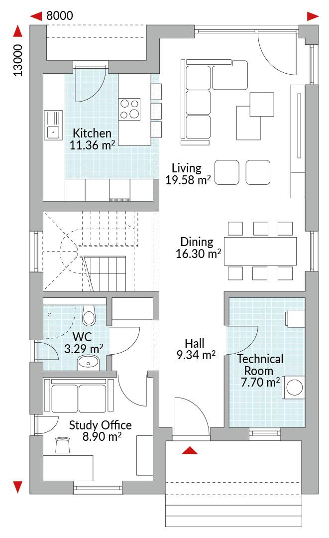 3-bedroom, 1.5-storey house, hall with staircase, WC, technical room, study/office, kitchen, open-plan living/dining area with outdoor access, master bedroom with large en-suite and walk-in wardrobe, two single bedrooms, family bathroom.