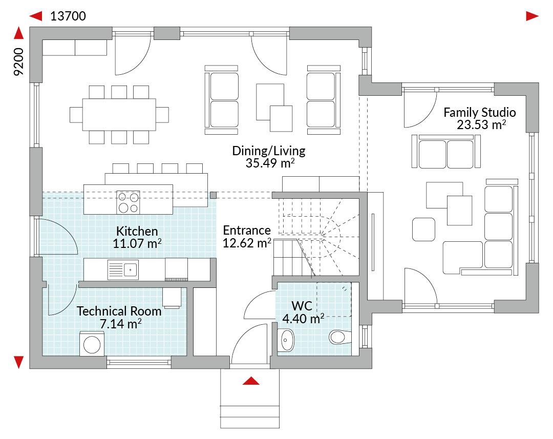 1½-storey, 3-bedroom detached house, entrance hall with staircase, open-plan living/dining area, family studio, kitchen with cooking island, technical room, WC, master bedroom with en-suite, two single bedrooms, family bathroom.