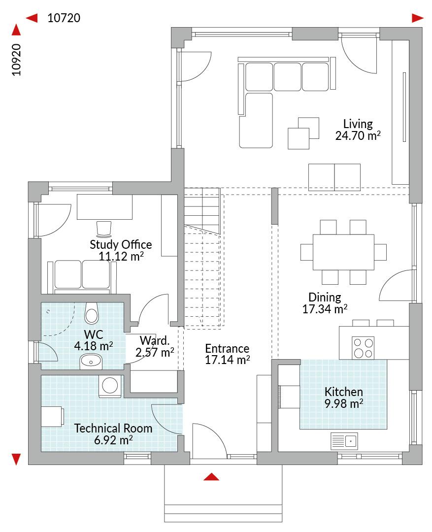 1½-storey, 3-bedroom house, entrance hall with staircase, open-plan living/dining/kitchen area, study office, technical room, WC, master bedroom with en-suite bathroom, walk-in wardrobe area and TV cabinet, two single bedrooms, family bathroom with shower, storage.