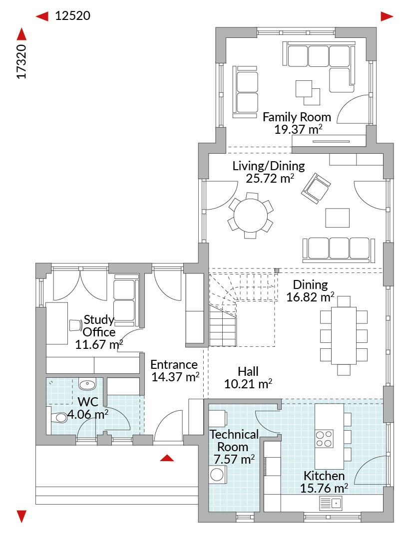 1½-storey, 3-bedroom detached house, entrance, open-plan hall/dining/living area with staircase, family room, kitchen with cooking island, technical room, study office, WC, master bedroom with en-suite and walk-in wardrobe area, two double bedrooms, family bathroom, storage.