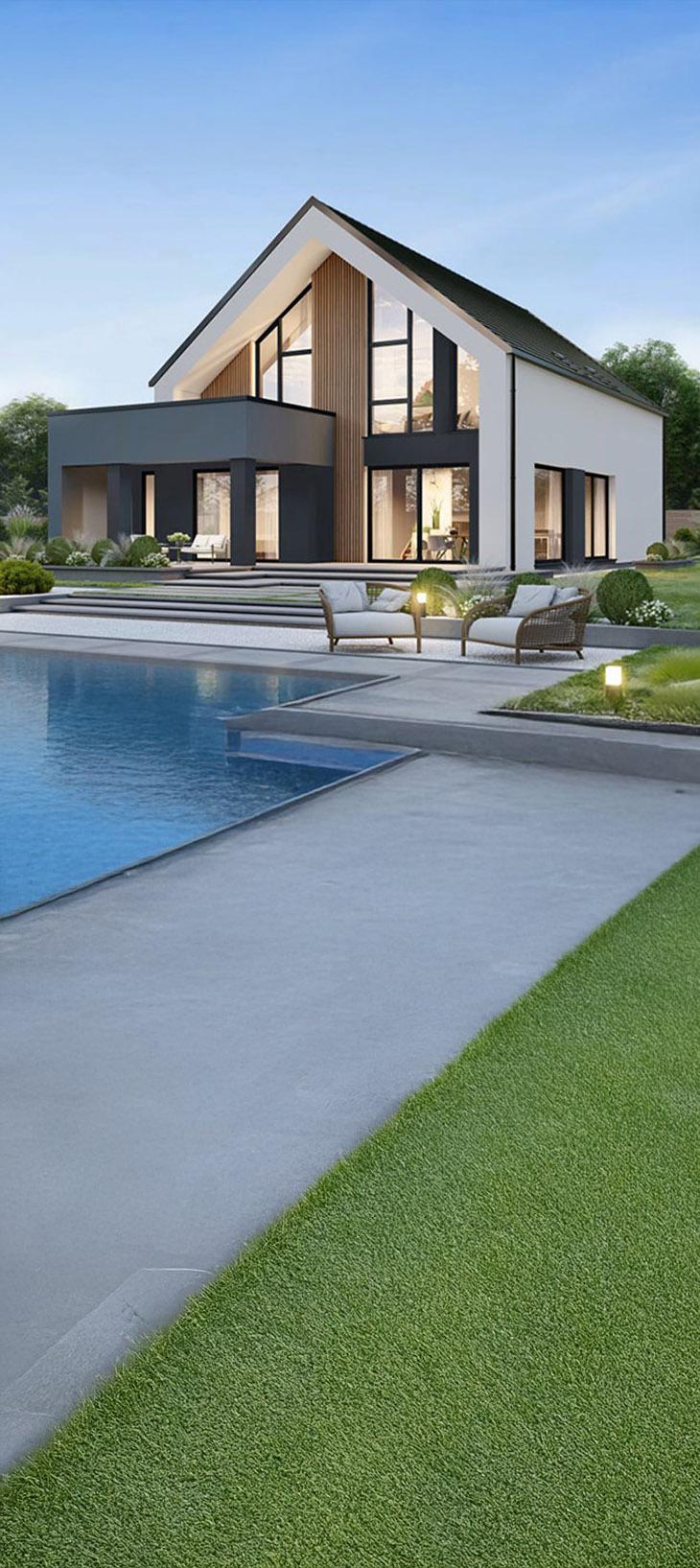 The S-Line offers special features as standard: elegant cube roofs, integrated sliding patio doors, wide eaves, raised ground floors of 2.67m, taller exterior doors, concealed beams, high-quality flooring, and stylish bathrooms with double vanities, large bathtubs, and glass showers. Everything is carefully coordinated – down to the smallest detail.