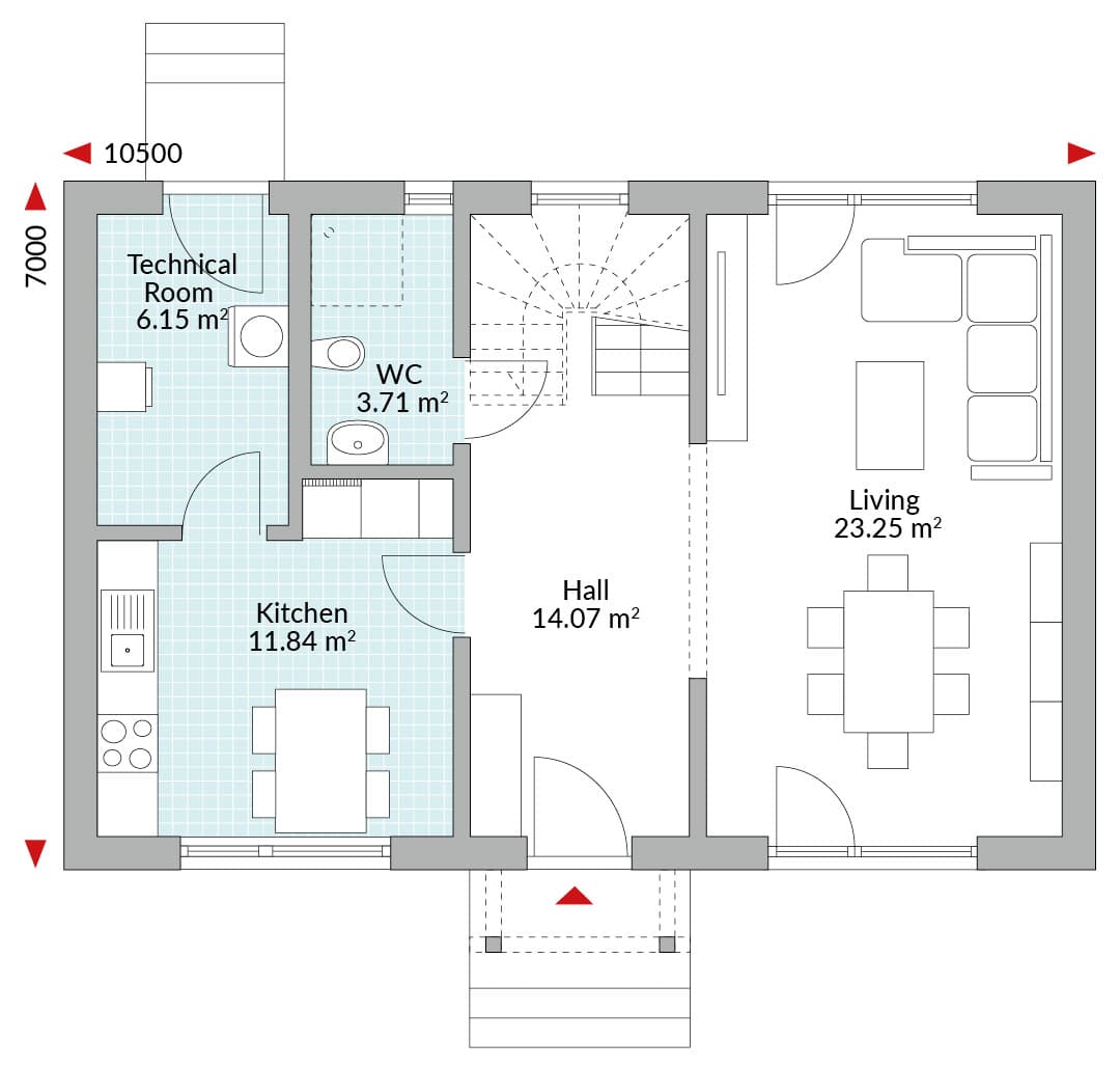 1½-storey, 3-bedroom detached house, hall with staircase, open plan living/dining area, kitchen/dining room, technical room, WC, master bedroom with en-suite bathroom, two single bedrooms, family bathroom with shower.