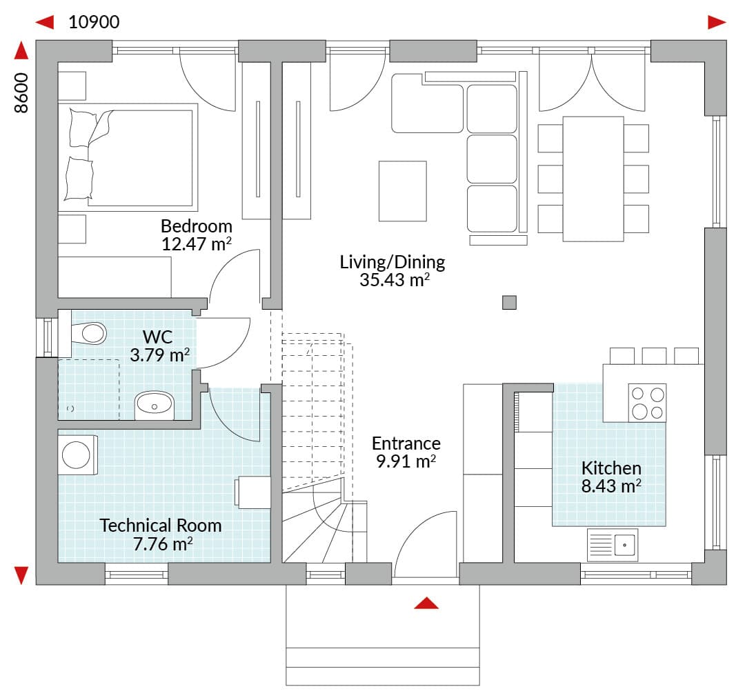1½-storey, 3-bedroom detached house, entrance with staircase, open-plan living/dining area, kitchen, double bedroom, technical room, WC, open landing, two large single bedrooms, family bathroom.