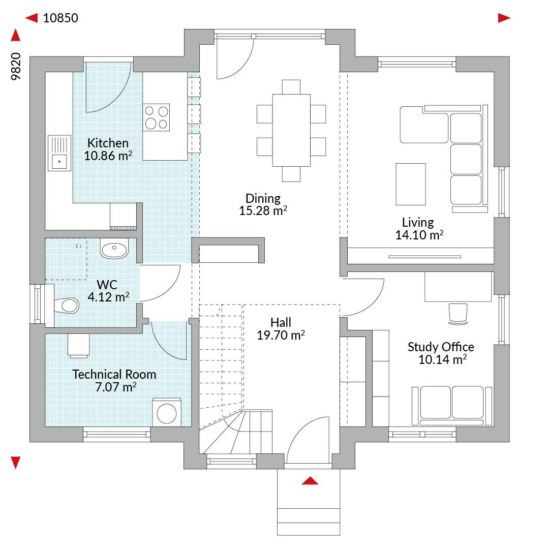 1½-storey, 3-bedroom detached house, entrance hall and staircase, open-plan living/dining area, kitchen, technical room, WC, study office, master bedroom with en-suite and walk-in wardrobe/dressing area, two single bedrooms, family bathroom, storage.