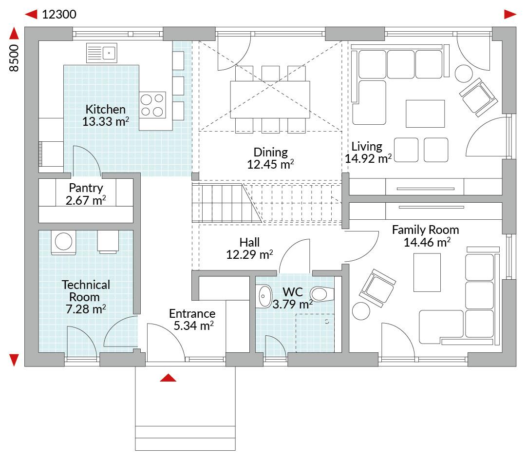 1½-storey, 3-bedroom detached house, entrance hall and staircase, open-plan living/dining area with ceiling void, family room, kitchen with pantry, technical room, WC, master bedroom with en-suite and walk-in wardrobe area, two single bedrooms, family bathroom.