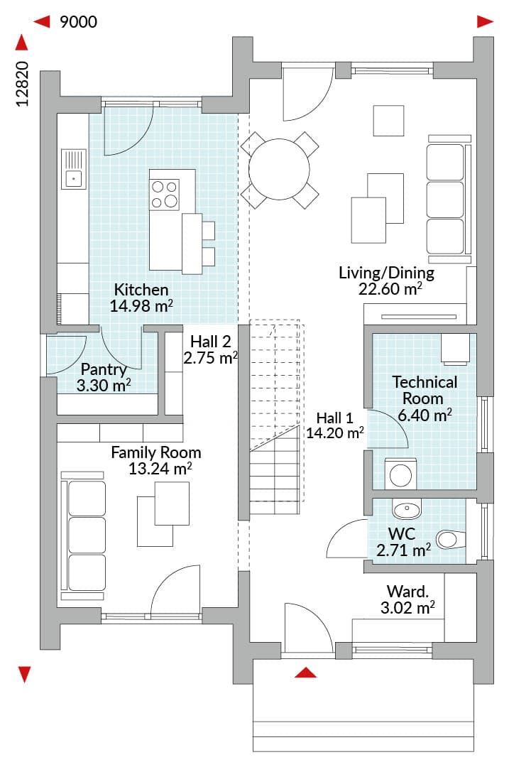 4-bedroom, 1.5-storey house, entrance hall with staircase and wardrobe, WC, technical room, open-plan kitchen/living/dining area with outdoor access, pantry, family room, master bedroom with en-suite, three single bedrooms, family bathroom, storage.