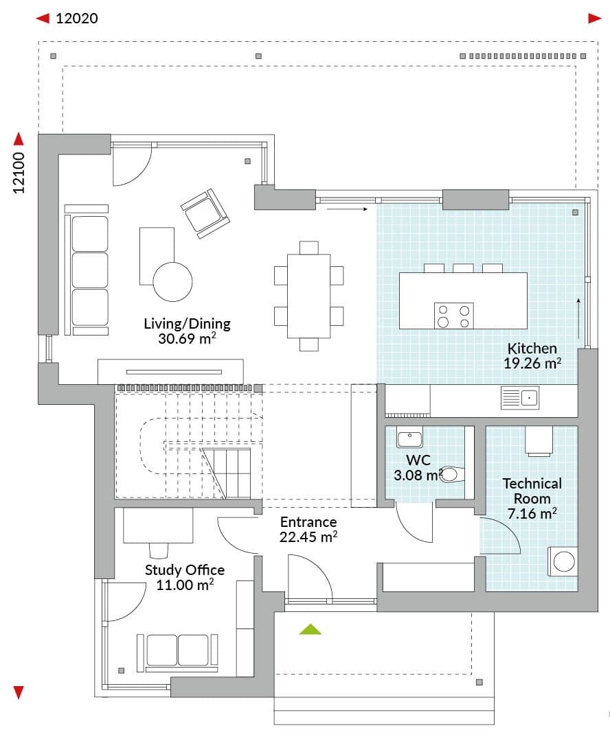1.5-storey house with entrance canopy over the higher front door; entrance with staircase; open-plan living/dining area with sliding doors to the terrace; kitchen with cooking island; study/office; technical room; WC; master bedroom with walk-in wardrobe area and en-suite with shower and double sinks; two single bedrooms; family bathroom; gable roof with 35° roof pitch; knee wall height 1.80 metres.