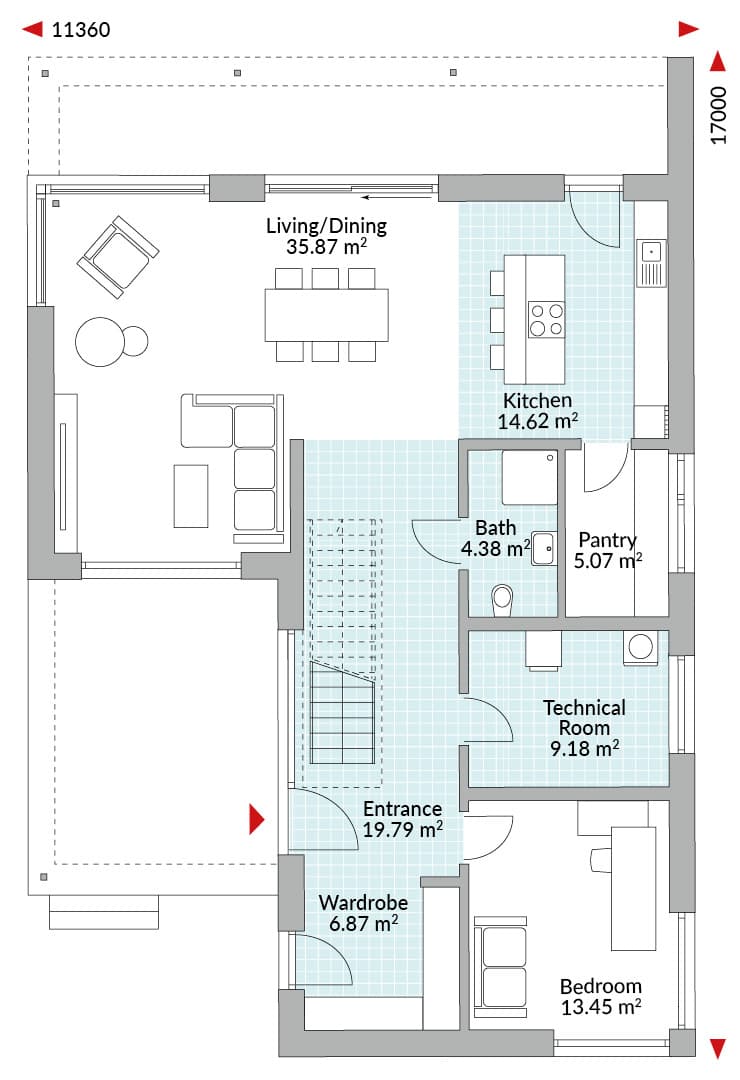 Two-storey house with all-round terrace roofing and a wide entrance roof over the higher front door; three bedrooms on the upper floor; master bedroom with walk-in dressing room and bathroom with free-standing bathtub, double sink and shower; second bathroom on the upper floor with shower; separate multi-purpose room on the ground floor; the higher ground floor with raised floor-to-ceiling corner glazing in the living room is designed as an open-plan kitchen/living/dining area with sliding doors to the terrace; pantry; technical room; hallway with cloakroom; guest WC with shower; knee wall height of 210cms; gable roof with 36° roof pitch.