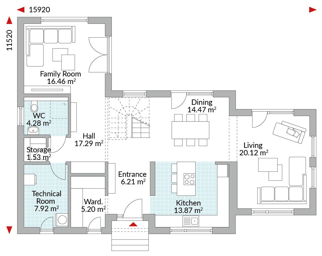 1½-storey, 4-bedroom detached house, entrance and hall with staircase, wardrobe, open-plan dining/living area, kitchen with cooking island, family room, technical room, WC, storage, master bedroom with en-suite and walk-in wardrobe area, three single bedrooms, family bathroom.