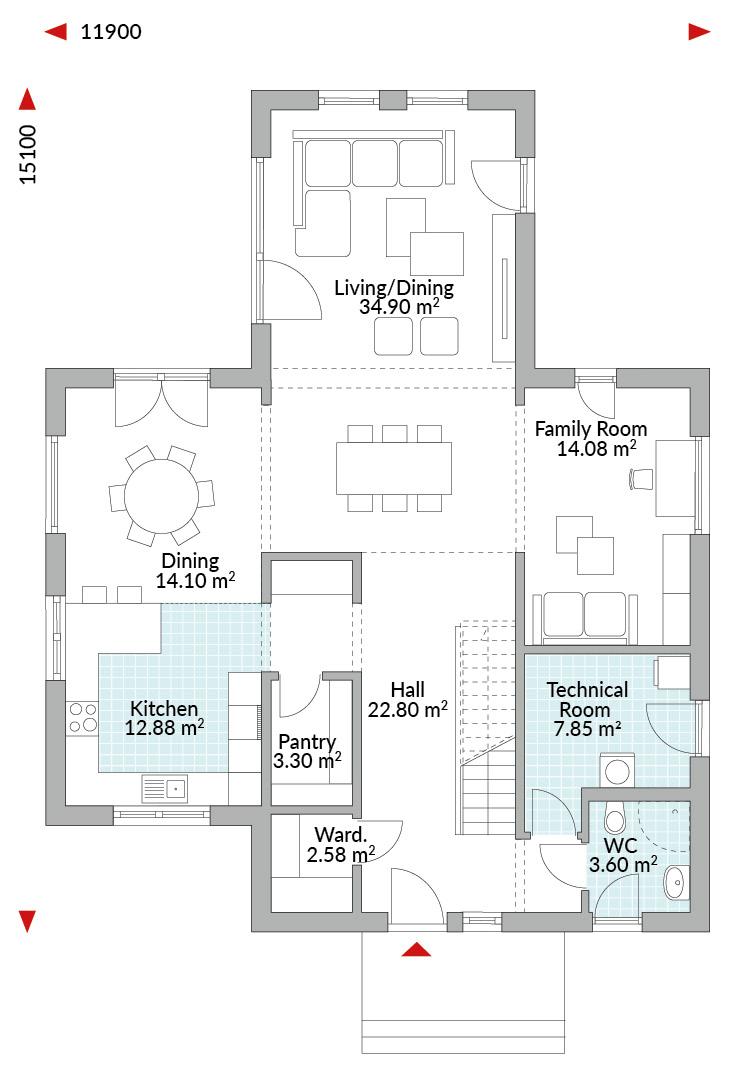 3-bedroom, 1.5-storey house, hall with staircase and wardrobe, WC, technical room, pantry, open-plan kitchen/living/dining area with outdoor access, family room, master bedroom with en-suite and walk-in wardrobe, two single bedrooms, family bathroom.