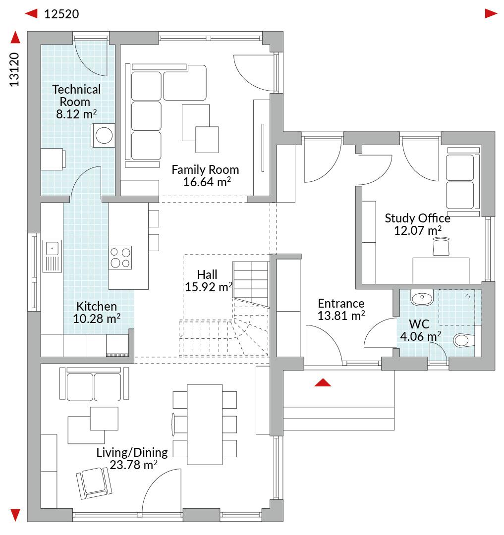 1½-storey, 3-bedroom detached house, entrance, hall with staircase, open-plan living/dining area, kitchen, family room, technical room, study office, WC, master bedroom with ensuite bathroom and walk-in wardrobe/dressing area, two single bedrooms (one with walk-in wardrobe area), family bathroom with shower, storage.