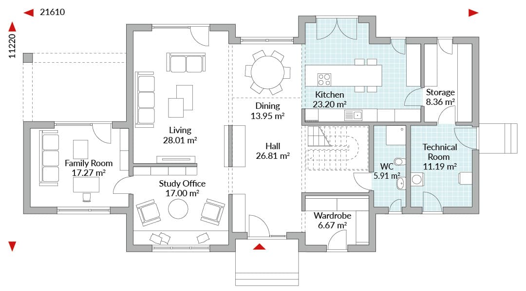 4-bedroom, 1.5-storey villa, hall, open-plan living/dining/kitchen, storage, technical room, study office, family room, WC, wardrobe, staircase, master bedroom with en-suite bath/shower room and wardrobe, double bedroom, two single bedrooms, family bathroom.
