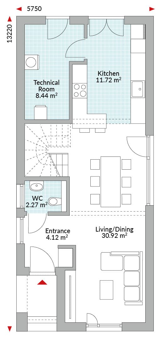 3-bedroom, 2-storey house, entrance, WC, technical room, kitchen, open-plan living/dining area with outdoor access, master bedroom with en-suite and large wardrobe area, two single bedrooms, family bathroom, storage.