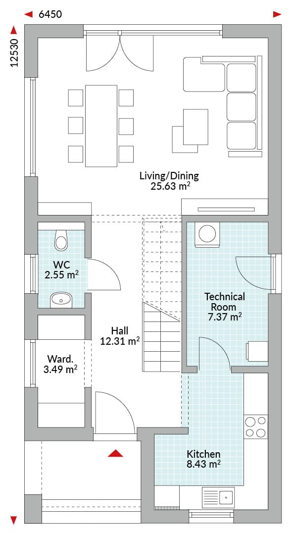3-bedroom, 2-storey house, hall with staircase and wardrobe, WC, kitchen, technical room, open-plan living/dining area with outdoor access, master bedroom with en-suite and walk-in wardrobe, two single bedrooms, family bathroom, wardrobe, storage.