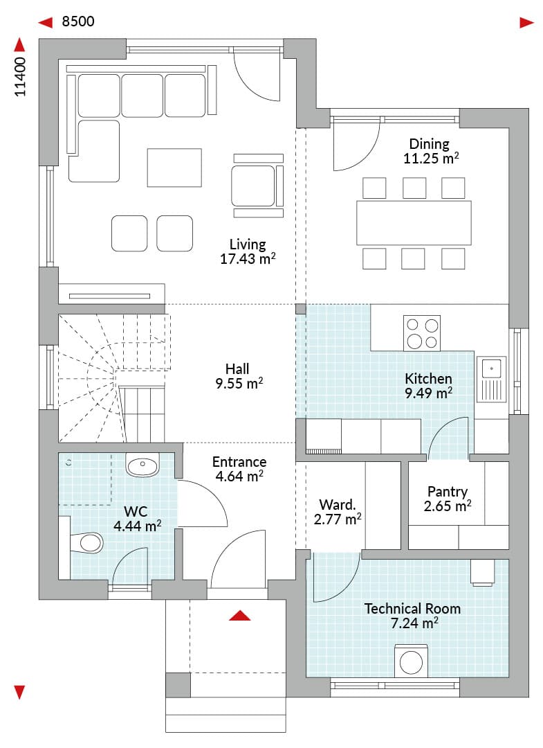 3-bedroom, 2-storey house, entrance hall with staircase and wardrobe, WC, kitchen, pantry, technical room, open-plan living/dining area with outdoor access, master bedroom with en-suite and walk-in wardrobe, two single bedrooms, family bathroom.