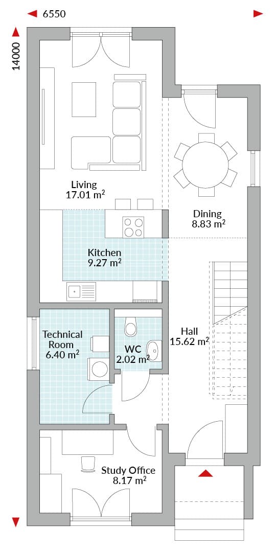 3-bedroom, 2-storey house, hallway and staircase, open-plan living/dining area with adjoining kitchen, large technical room, WC, master bedroom with en-suite bathroom and walk-in wardrobe, two single bedrooms, family bath/shower room.