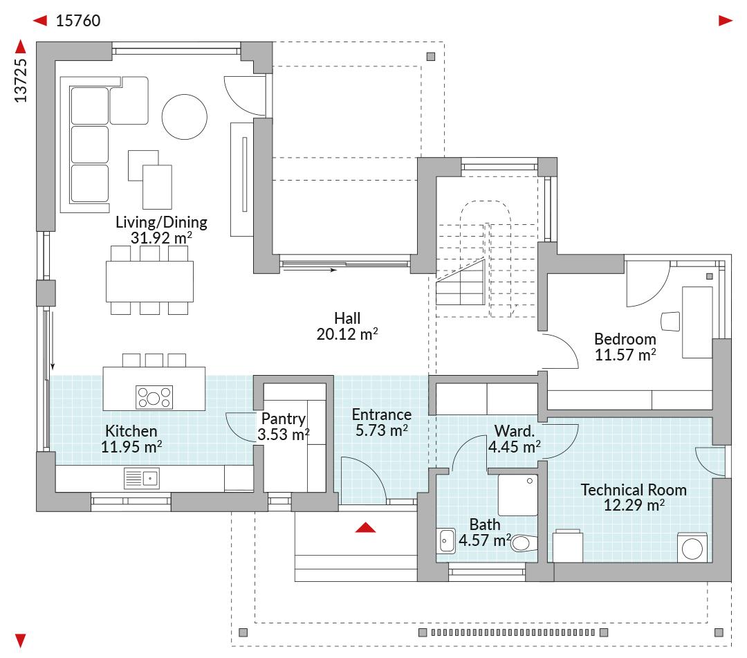 Two-storey house with a wide entrance roof on the higher front door and a straight corner bay window; terrace partially covered by roof overhang; three bedrooms and hallway on the upper floor; master en-suite bedroom with free-standing bathtub, shower, double sink and separate dressing room; additional second shower room; the raised ground floor is designed with higher windows as an open-plan kitchen/living/dining area with sliding doors to the terrace; separate pantry; guest WC; technical room and hallway with cloakroom; gable roof without roof overhangs; 35° roof pitch.