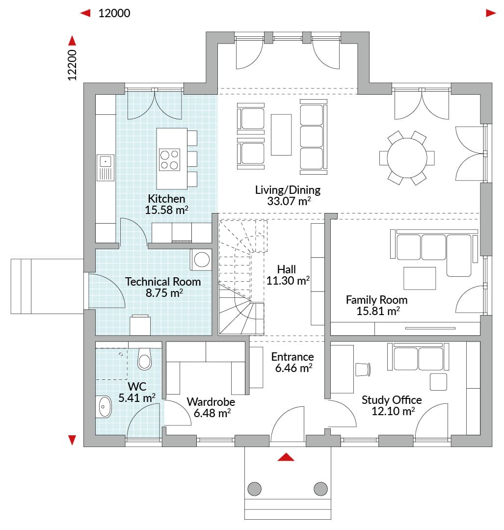 2-storey, 5-bedroom villa, entrance hall with staircase, cloakroom, open plan living/dining/family room, kitchen with cooking island, technical room, WC, study/office, master bedroom with walk-in wardrobe/dressing area and en-suite, double bedroom, three single bedrooms, family bathroom, storage, hipped roof with 26° roof pitch.