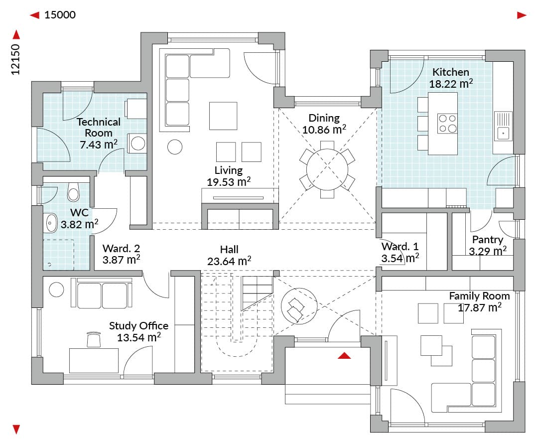 2-storey, 4-bedroom villa, entrance hall with staircase, cloakroom, open ceiling, open plan living/dining/kitchen area with cooking island, family room, technical room, WC, study/office, master bedroom with walk-in wardrobe/dressing area and en-suite, double bedroom, two single bedrooms, family bathroom, storage, balcony, roof with 35° roof pitch.