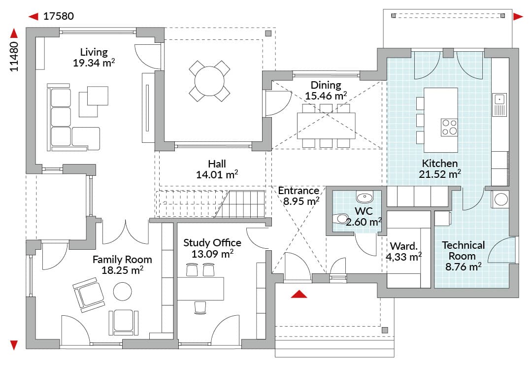 4-bedroom, 2-storey villa, entrance hall, open-plan dining/kitchen area, living room, family room, study office, technical room, wardrobe, WC, master bedroom with wardrobe/dressing room and en-suite bath/shower room, three single bedrooms, family bathroom, storage.