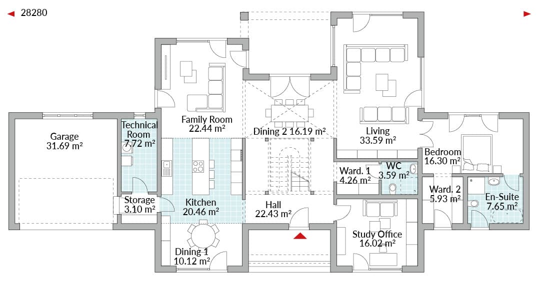 5-bedroom, 2-storey villa, entrance hall with staircase and dining area, living room, study office, family room, kitchen/dining area, technical room, storage, WC, wardrobe, en-suite double bedroom with wardrobe, adjoining garage, master bedroom with wardrobe and en-suite, three single bedrooms, family bathroom, storage.