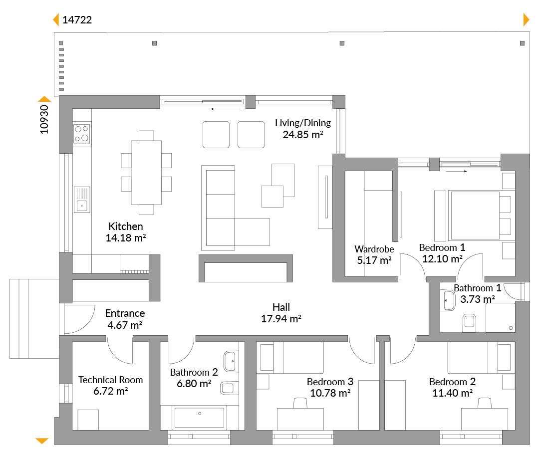 This angled bungalow requires a slightly larger plot, but benefits from an attractive and very useful sheltered terrace. The square at the angle forms a perfect sun deck as it's framed by two sides of the house. Perfect positioning for eating, lounging and entertaining.