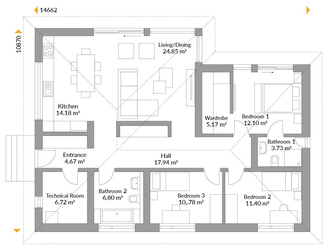 This angled bungalow requires a slightly larger plot, but benefits from an attractive and very useful sheltered terrace. The square at the angle forms a perfect sun deck as it's framed by two sides of the house. Perfect positioning for eating, lounging and entertaining.