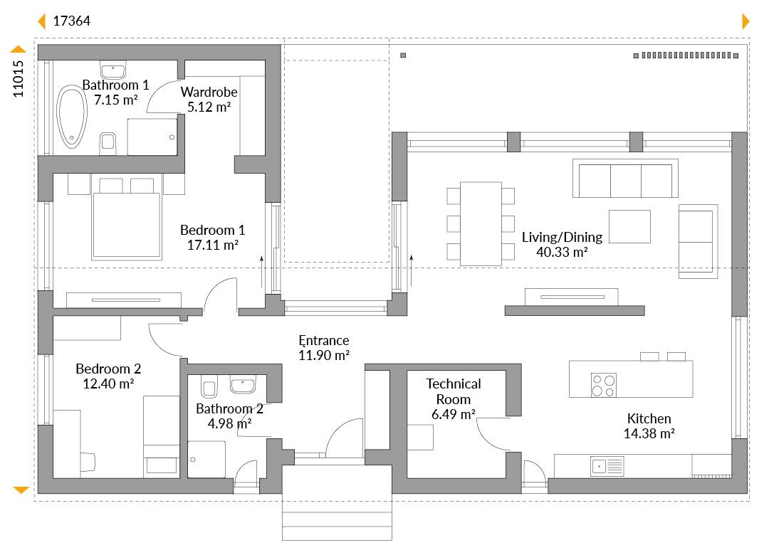 The generous glazing and the no-overhang gable roof emphasise the modern character of this modular bungalow. Two areas in the house, separated by a covered terrace, offer every comfort: on one side for relaxed living, cooking and dining, and the other side for sleeping, dressing and relaxing. An additional room is suitable as a study or guest room. Large sliding windows pave the way outside, while wall-high panoramic windows allow the living space and nature to merge and ensure an abundance of daylight in the house.