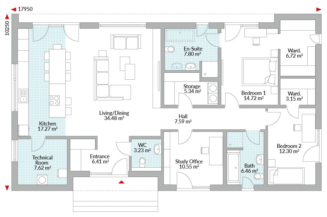 2-bedroom bungalow, entrance, WC, open-plan living/dining/kitchen area with cooking island, technical room, study/office, master bedroom with en-suite bath/shower room and large walk-in wardrobe, single bedroom with walk-in wardrobe, family bathroom, storage.