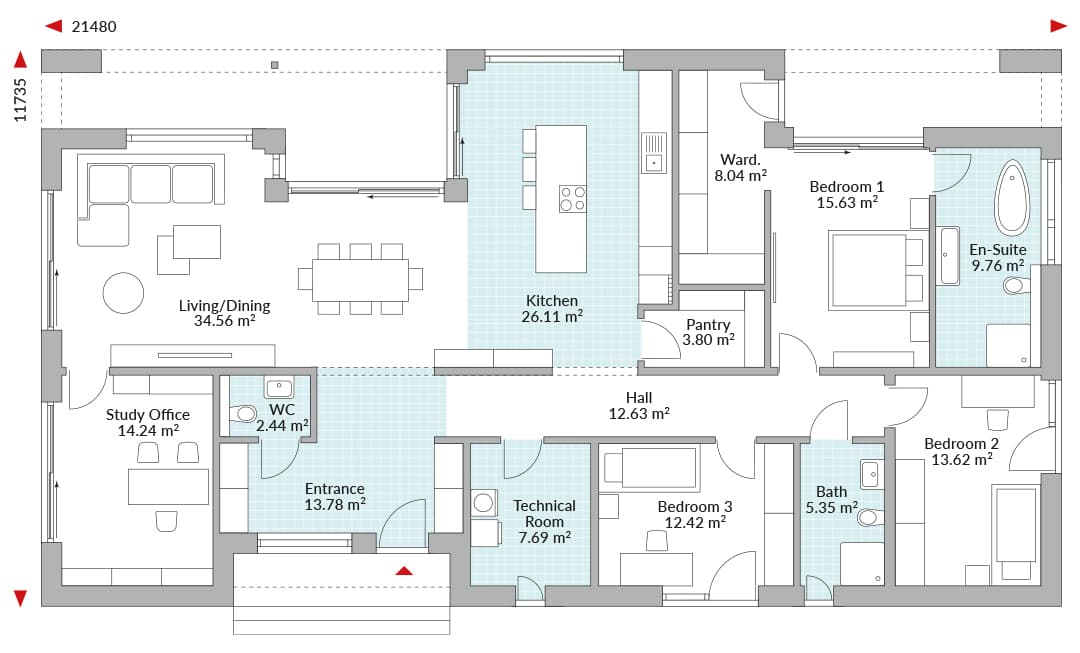 Bungalow with a recessed entrance area to cover the higher front door; terrace in the garden area covered by a roof overhang; the higher ground floor in the dining area with its tall windows is designed as an open-plan kitchen/pantry/living/dining area with sliding doors to the terrace and garden; separate studio for guests or as a home office; three bedrooms, including a master bathroom with en-suite bathroom and walk-in wardrobe; all bedrooms have access to the outside; additional shower room and guest WC; technical room; hall and hallway.