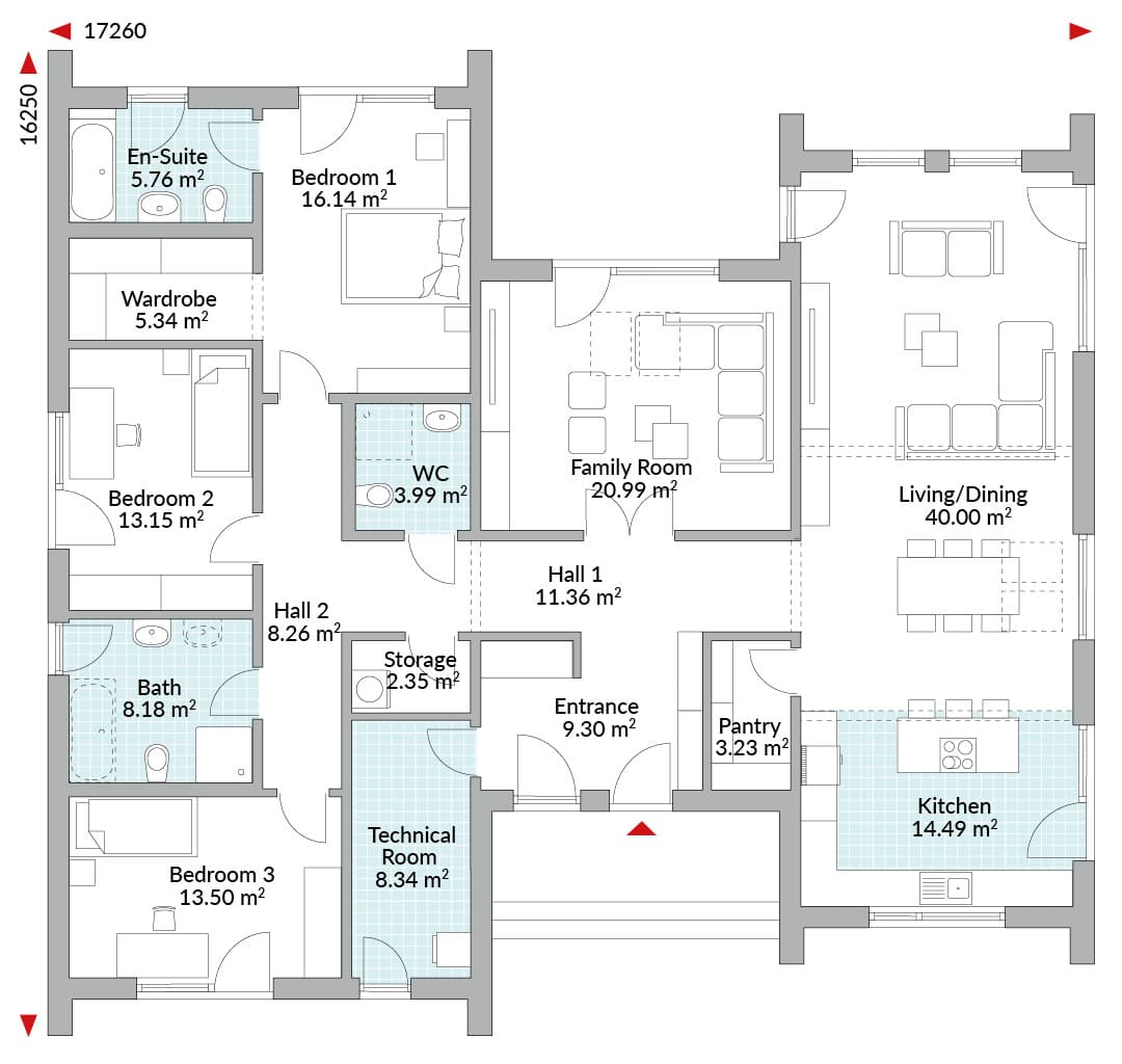 3-bedroom bungalow, entrance and hallway, WC, open-plan living/dining/kitchen area with cooking island, pantry, technical room, family room, master bedroom with en-suite bath/shower room and walk-in wardrobe, two single bedrooms, family bathroom, storage.