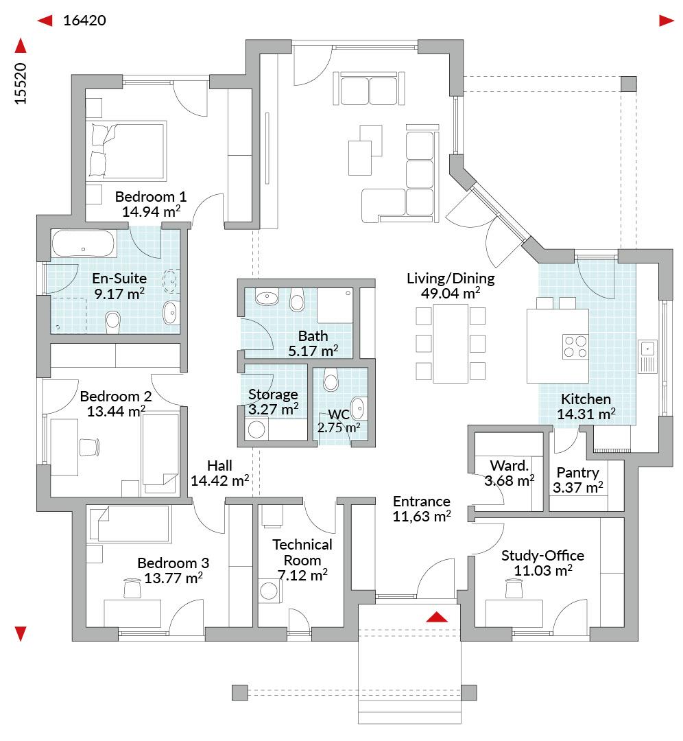3-bedroom bungalow, entrance and hallway, WC, open-plan living/dining area, kitchen area with cooking island, technical room, study/office, master bedroom with en-suite bath/shower room, two single bedrooms, family bathroom, storage.