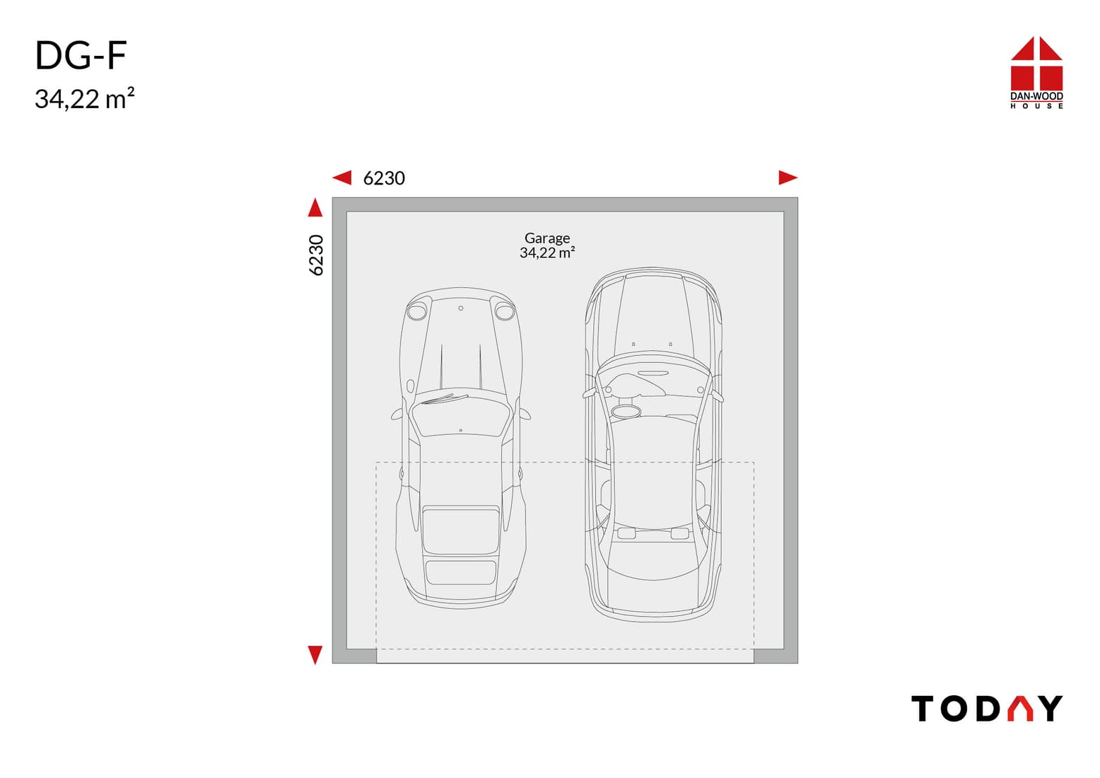 Double garage with flat roof (34.22m²); external dimensions 6.23m x 6.23m.