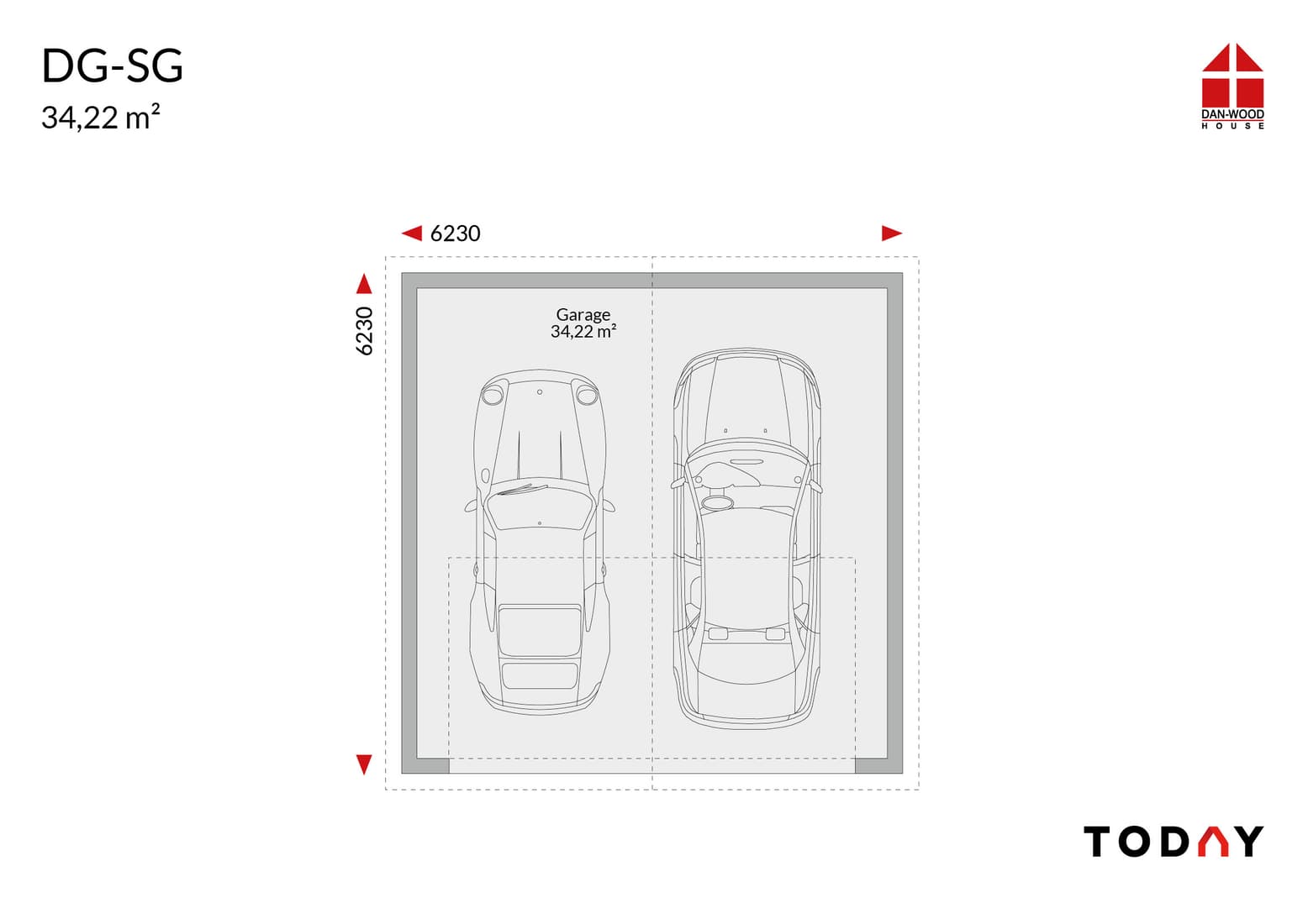 Double garage (34.22m²); gable roof with access to the gable; external dimensions 6.23m x 6.23m.