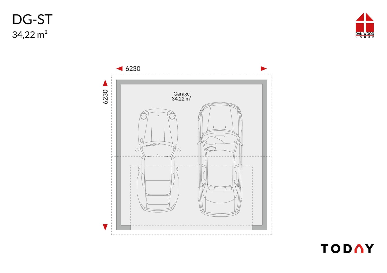 Double garage (34.22m²); gable roof with access to the gable; external dimensions 6.23m x 6.23m.