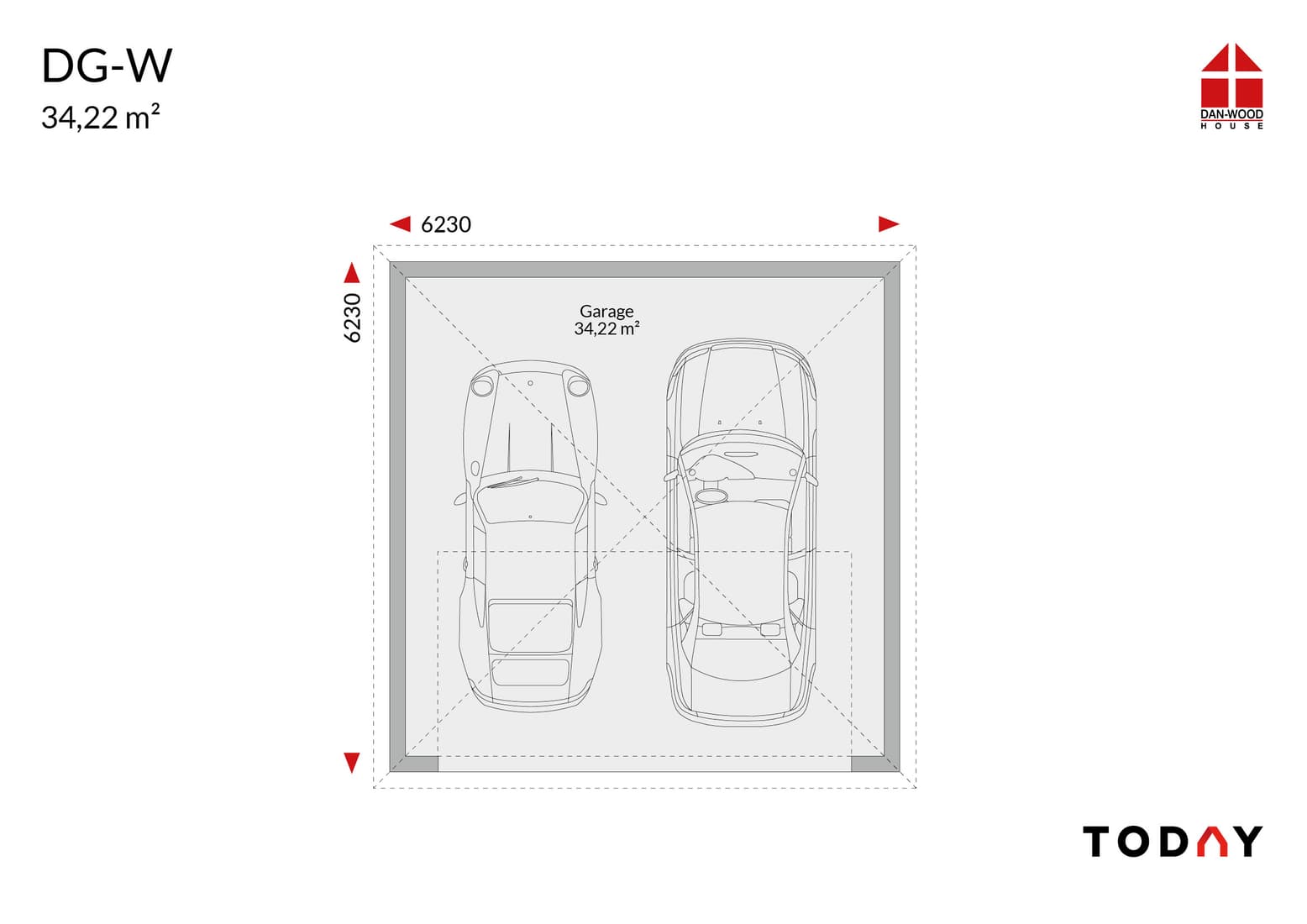 Double garage with hipped roof (34.22m²); external dimensions 6.23m x 6.23m.