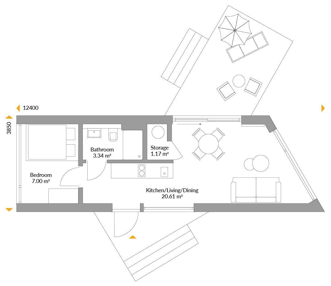 Need a bit more space? If you’d like a one-bedroom modular holiday home with a bit more space, we have the larger NEXT Holiday 32 L-1 E. This L version is an extra one metre in width, bringing a total of 9sqm more living space. This is most noticeable in the bedroom and the living/dining area, where two additional guests could sleep on the sofa bed and easily find space at the dining table. The kitchenette and the panoramic windows are also larger in the L version, so this minimalist holiday home is definitely suitable for weekend family breaks.