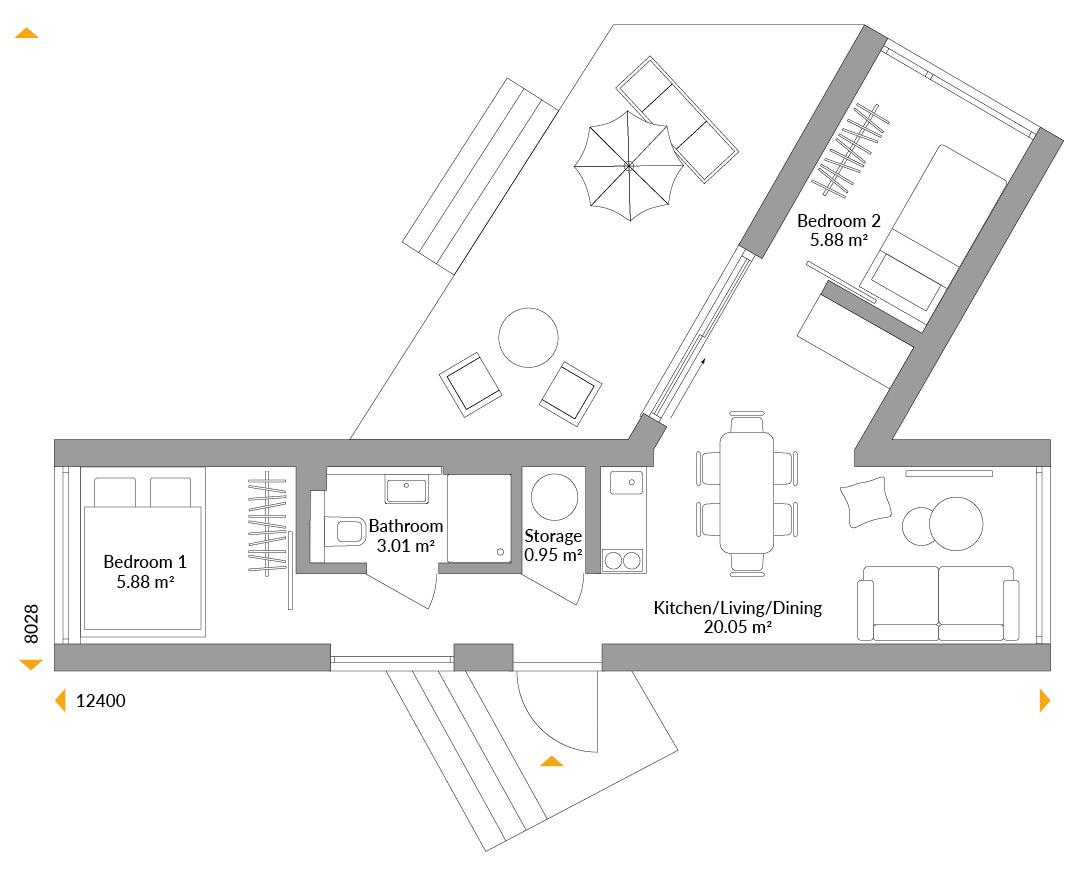 Got a bigger group? The beauty of modular houses is that if you need extra rooms you can add them, especially if it’s a second bedroom and an additional large wardrobe, because for four people – or even a maximum of six – you need a bit more living and storage space. And despite the narrow S modules, there is still space for a large table where you can eat and play together. The addition of the side wing also provides a wind-protected terrace space, a permanent fixture and just like having a sunroom.