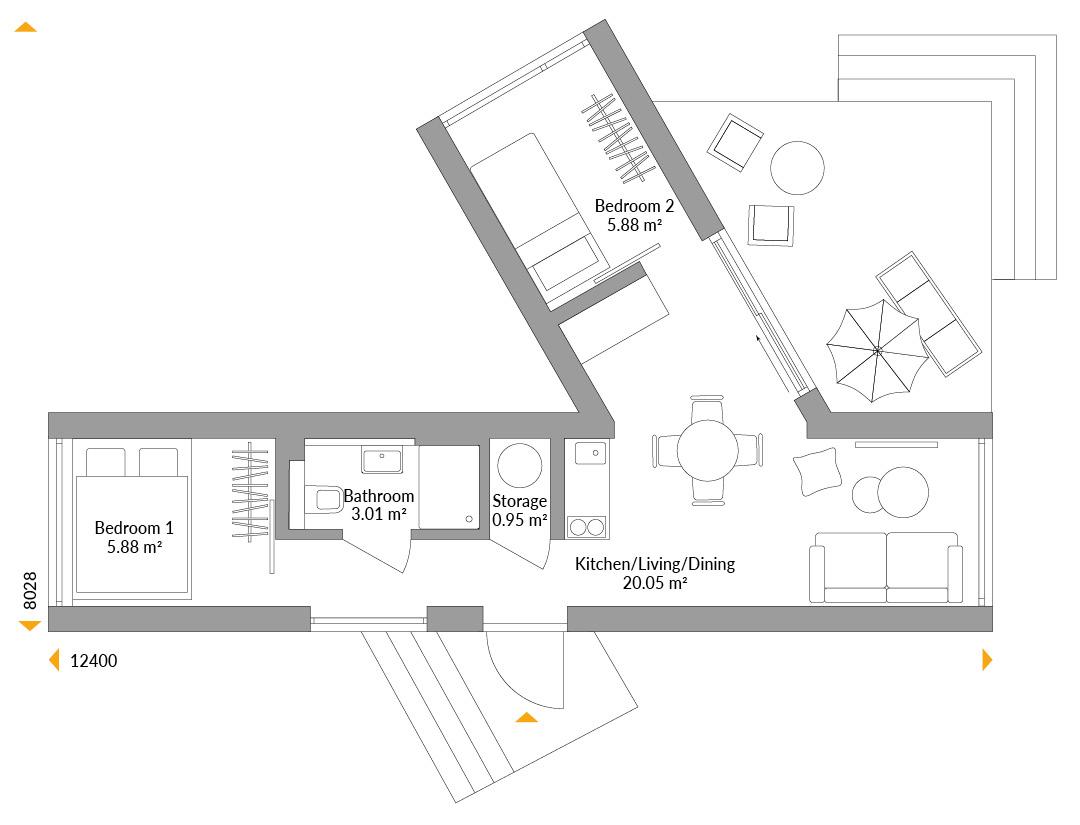 Narrowly spacious: this elegant NEXT Holiday home with its natural-coloured slated cladding is almost 36sqm. It’s constructed using narrow S-modules but there is still space for a second bedroom thanks to the additional docked wing which also increases space for family gatherings in the living area between the two modules. The large, glazed windows offer wonderful views in all four directions, while a sheltered terrace provides additional outdoor living space.