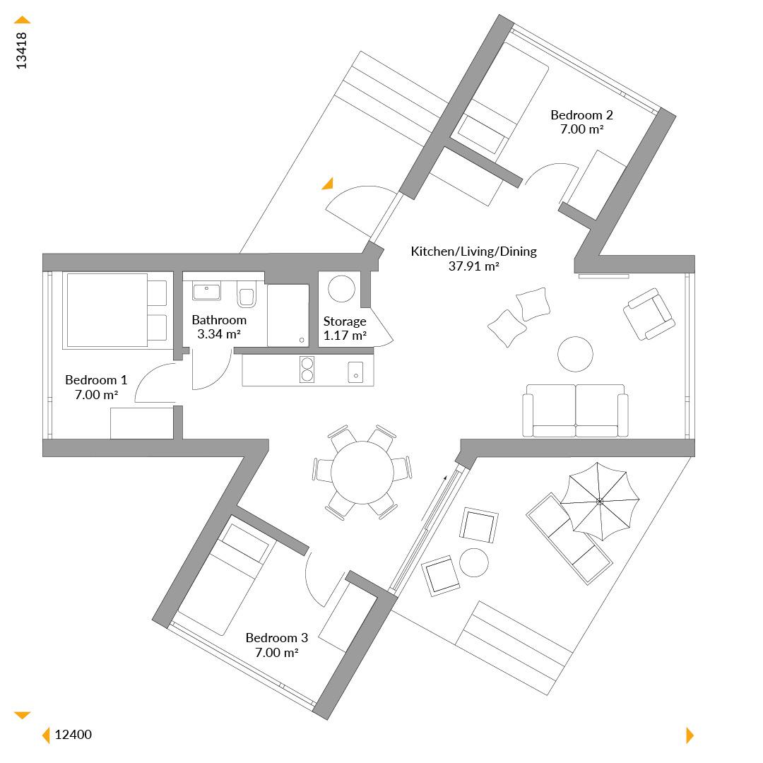 Holiday with friends: At 63sqm, this holiday home is our largest NEXT Holiday home. Built from L-modules and with two side wings, it offers three bedrooms and a spacious and light-flooded common area with a lounge and separate dining area. The kitchenette provides everything you need for self-sufficiency, and the modern bathroom is truly luxurious. Five fully glazed panoramic walls bring the surrounding nature directly into the house and, together with the wind-protected terrace, create a fantastic holiday home.